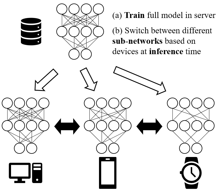 - At runtime, edge devices can select the most suitable sub-network configuration depending on available resources, achieving significant adaptability without retraining or switching between multiple models.